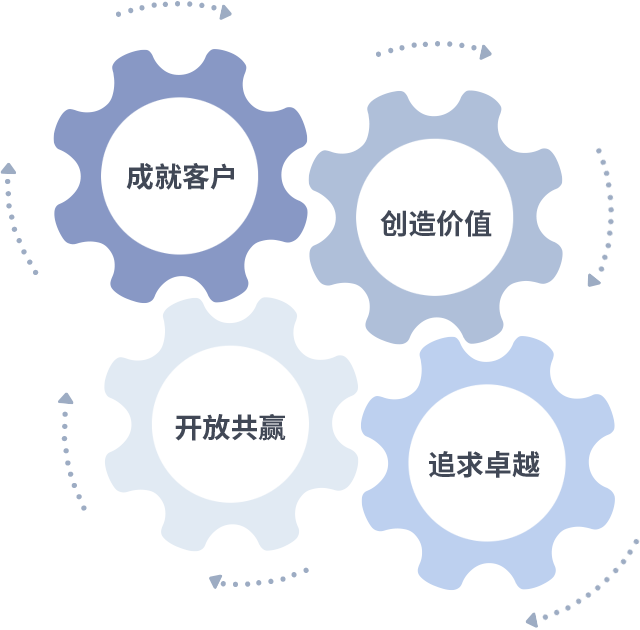 成就客户是一切决策的出发点,创造价值是衡量所有工作的标准,追求卓越是CC网投做事做人的态度,开放共赢是CC网投的格局也是最终的结果。价值观的齿轮环环相扣,推动着组织里的每个人不断向前。